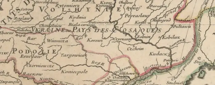 Dòng chữ được dịch là “Ukraine hay vùng đất của người Cossaks” và nằm cạnh sông Dnipro chảy qua Ukraine ngày nay. Thủ đô Kyiv, đánh vần là Kiow trên bản đồ, cũng có thể nhìn thấy gần đó.